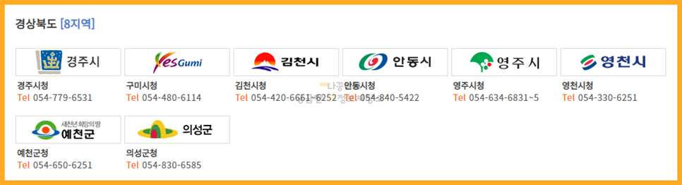 경상북도의 경우 8개 지역 경주시, 구미시, 김천시, 안동시, 영주시, 영천시, 예천군, 의성군에서 시행하고 있습니다.