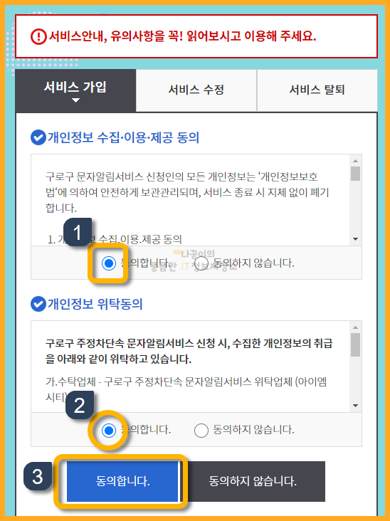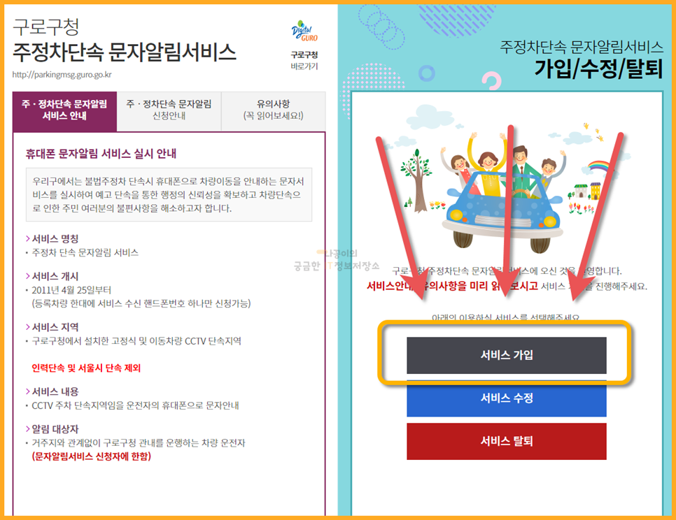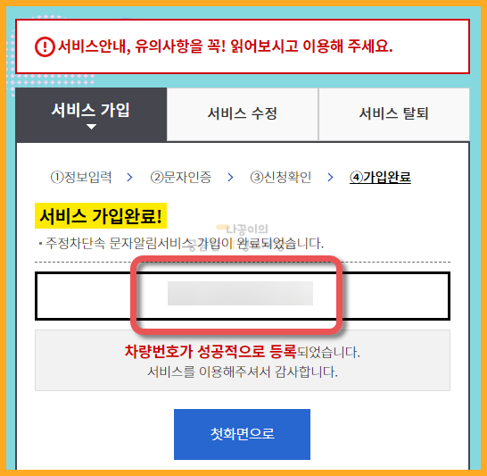가입이 완료되었다는 메세지가 나오고 이제 구로시에 주정차를 하고 무인이나 이동식 주정차 단속에 걸리게 될 경우에 주정차단속 문자알림 서비스에 의해 메세지가 전송됩니다.