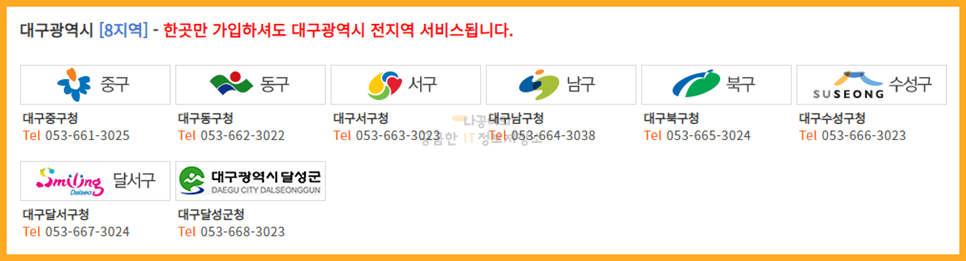 대구의 경우에도 인천과 마찬가지로 한 곳만 가입해도 전 지역에 서비스가 가능하다고 합니다.