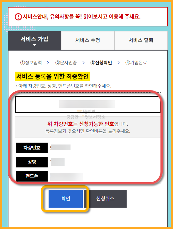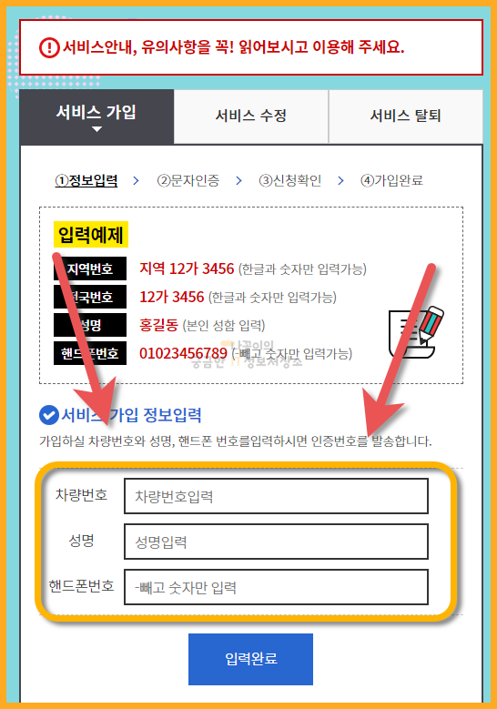 가입버튼을 누르고 다음과 같이 개인정보에 대해 동의를 해주시면 차량번호와 성명 그리고 핸드폰 번호를 입력하는 곳이 나오게 됩니다.