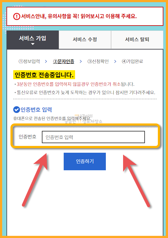이 인증번호는 3분 안에 입력해야하며, 3분이 지나면 인증번호가 취소되어 다시 인증을 받아야 하니 늦지 않게 입력해주시기 바랍니다.