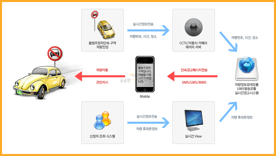 불법주정차단속 구역에 차량이 진입하면 주정차단속 문자알림 서비스에 가입한 사람과 비교하여 '불법주정차 구역입니다. 차량을 이동시키기 바랍니다'라는 문자알림을 보내게 됩니다.