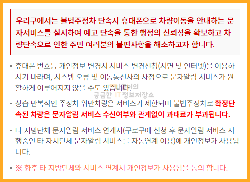 그리고 다음과 같이 유의사항에 보시면 상습적으로 반복해서 위반할 경우에는 서비스가 제한되고 문자알림 서비스에 오류로 인해 서비스 수신이 안되었을 경우에도 과태료가 부과된다고 되어 있습니다.