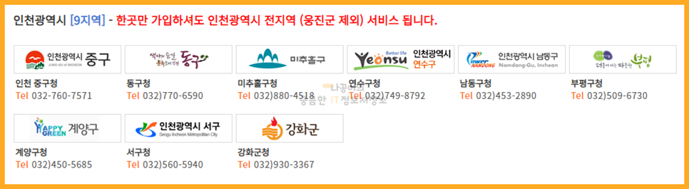 인천의 경우 9개 지역 중구, 공구, 미추홀구, 연수구, 남동구, 부평구, 계양구, 서구, 강화군에서 서비스가 가능합니다.