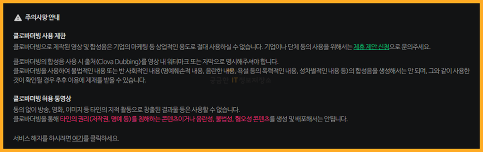 아래는 클로바 더빙에서 제공하는 주의사항입니다.