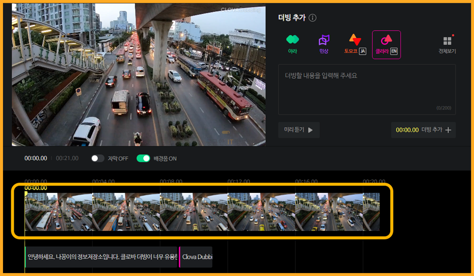 업로드를 완료하면 다음과 같이 자막 위로 영상이 들어가게 되고, 영상의 타이밍에 맞춰서 더빙의 위치를 변경하면서 편집을 할 수 있습니다.