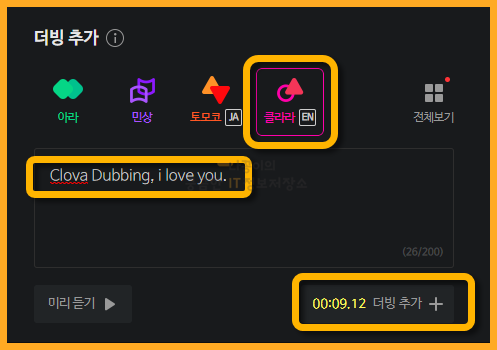 다음과 같이 'Clova Dubbing, i love you.'라는 문장을 쓰고 더빙을 추가해봅니다.