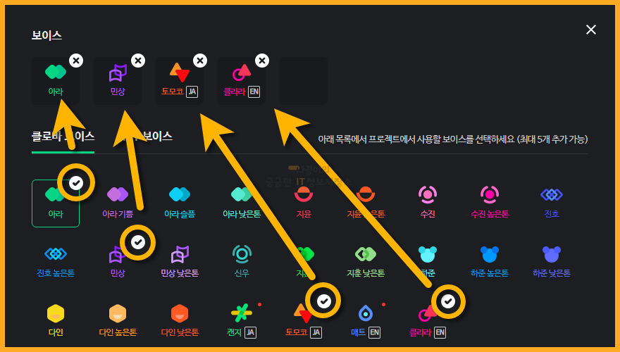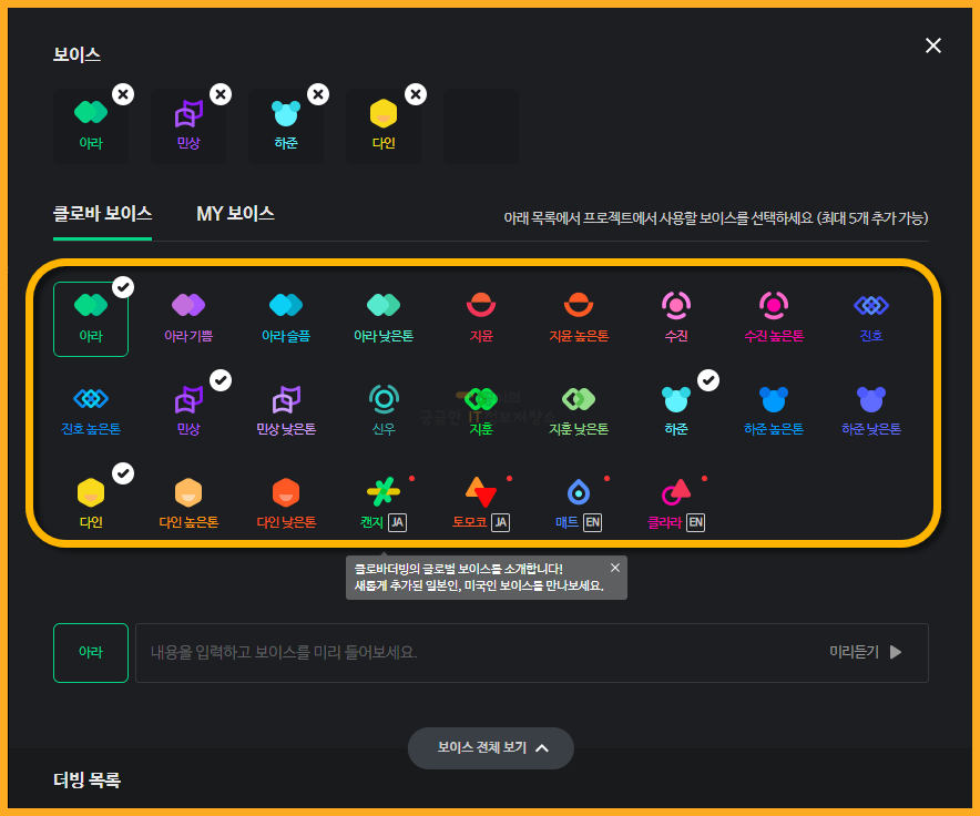 그럼 미리듣기를 이용해서 마음에 드시는 목소리를 찾으신 후, 다음과 같이 체크박스에 체크를 해서 사용할 목소리를 5개까지 선택할 수 있습니다.