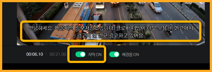 그리고 동영상을 올리면 자막ON이라는 버튼이 있는데 그것을 누르면 더빙 음성 뿐만 아니라 자막까지 한 방에 해결이 가능합니다. 다만, 자막 텍스트의 크기나 위치, 색, 배경, 그림자 등의 옵션은 제공하지 않는 것 같습니다.