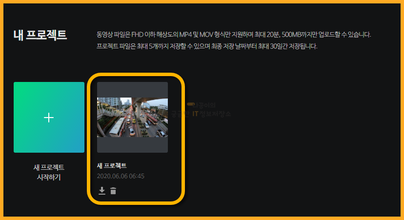 또한 동영상을 올려서 영상을 확인하며 더빙을 입힐수도 있는데요. 동영상의 경우에 각 프로젝트는 아래와 같이 동영상 파일은 FHD이하 확장자는 MP4와 MOV 형식만 사용이 가능하며 최대 20분입니다. 또한 용량도 500MB 이하로 제한되어 있습니다.