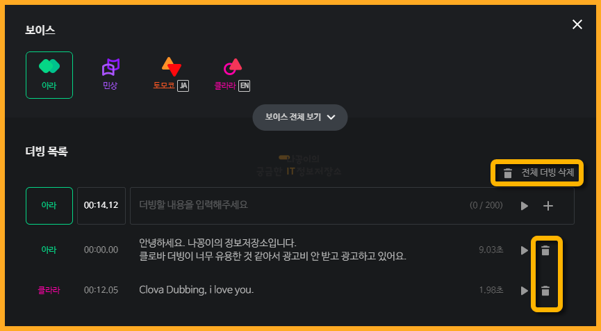또한 파일을 클릭하고 다른 목소리를 선택해서 기존에 더빙된 목소리를 여기서 변경할 수도 있습니다.