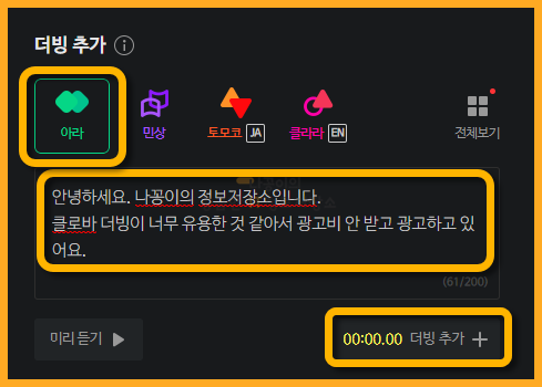 확인하는 이유는 문장의 띄어쓰기나 쉼표, 은는이가 등의 조사에 따라서도 더빙의 자연스러움이 달라지기 때문에 미세하게 조절해야 하는 홍보물 등에서는 반드시 미리 듣기로 조절하신 뒤에 더빙을 추가하시길 추천합니다.