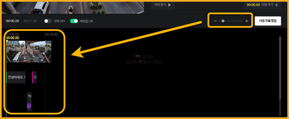 편집화면이 너무 넓어 더빙 파일을 몇 개 추가하면 한 눈에 확인이 안 될 때가 있습니다.