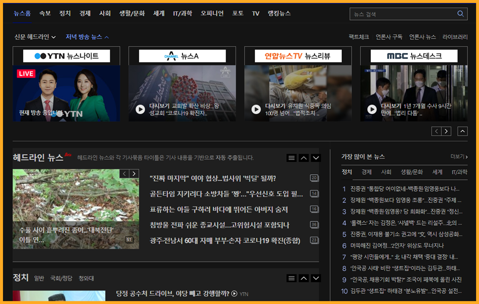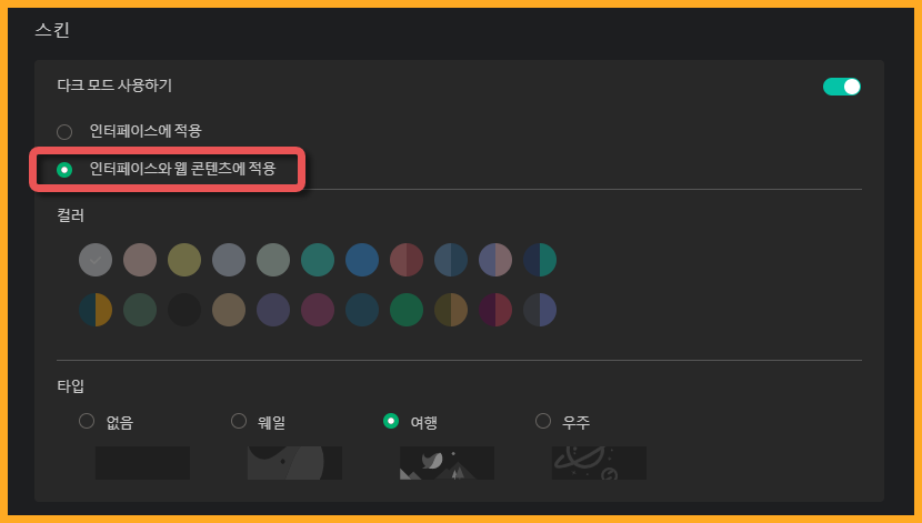 네이버 웨일의 다크모드는 위 사진처럼 일단 적용이 매우 간단한 장점이 있고, 아래와 같이 인터페이스와 웹 콘텐츠에 적용하는 것도 아주 간단한 편입니다. 보통 크롬에서는 다크모드 변경은 쉽지만 콘텐츠까지 변경하려면 확장프로그램을 설치해야 하기 때문입니다.