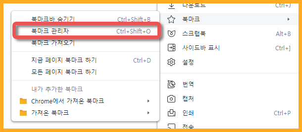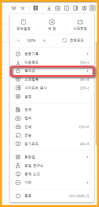 그 다음에 북마크 관리자로 들어가줍니다. 다시 한번 이 포스팅을 하면서 느끼지만 정말 크롬 쌍둥이 동생같은 브라우저 입니다. 분할기능이나 스크린샷 등의 기능을 기본 탑재했다는 정도만 다르고 로그인 위치나 메뉴 위치 등 비슷한 부분이 많습니다. 물론 웨일에는 확장프로그램을 설치하지 않아도 사용할 수 있는 기능이 더 많다는 것은 인정하지만 말이죠.