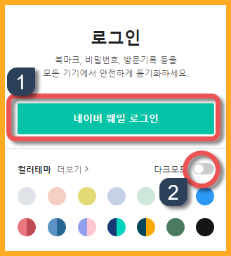 그리고 나타나는 화면에서 로그인을 해줍니다. 참고로 2번은 다크모드 설정인데 개인적으로는 다크모드를 좋아합니다. 다크모드 설정 만큼은 크롬보다 더 나은 것 같습니다.