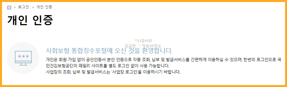 위와 같은 간단한 안내가 나오고 아래쪽에 주민등록번호를 입력하시고 공인인증서로 로그인을 해줍니다.