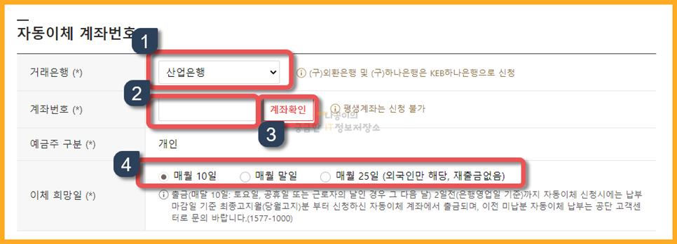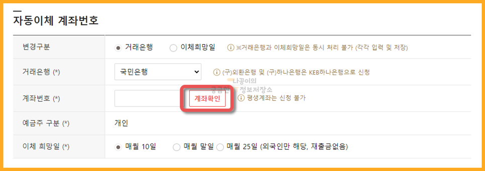 그 아래에는 자동이체 계좌번호를 입력하는 곳이 나옵니다. 순서대로 은행을 정해주시고 계좌번호를 입력 후 '계좌확인'을 눌러줘야합니다. 그리고 이체 희망일을 지정할 수 있는데 저는 매월 10일로 지정하도록 하겠습니다.