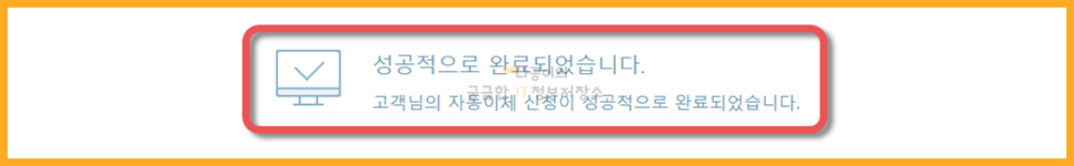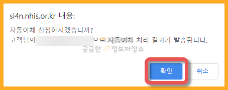 그럼 마지막으로 확인하는 창이 나오고 확인 버튼을 클릭하면 국민건강보험 자동이체 신청이 마무리 됩니다.