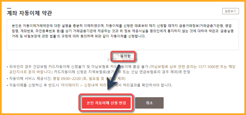 모두 완료하셨다면 동의함에 체크 후 본인 자동이체 신청 변경 버튼을 클릭해주시면 국민건강보험 자동이체 계좌변경이 모두 완료됩니다.