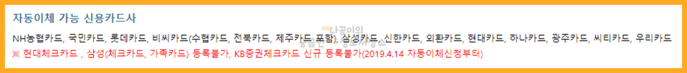 또한 자동이체가 가능한 신용카드사도 많이 있지만 현대체크카드와 삼성체크카드, 삼성가족카드는 자동이체가 불가능하니 참고해주세요.