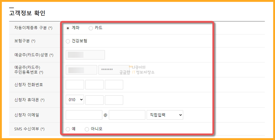 여기에 계좌로 할 것인지 카드로 할 것인지를 비롯한 정보를 입력해주시기 바랍니다. 크게 불편하지 않으시다면 돈이 나가는 것이므로 SMS는 수신에 체크하시길 권장드립니다.