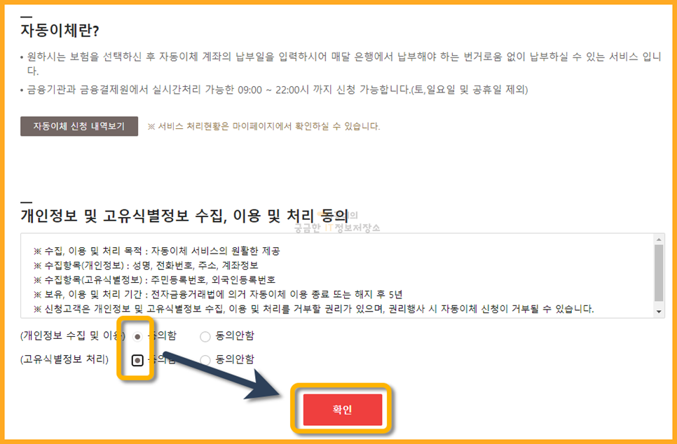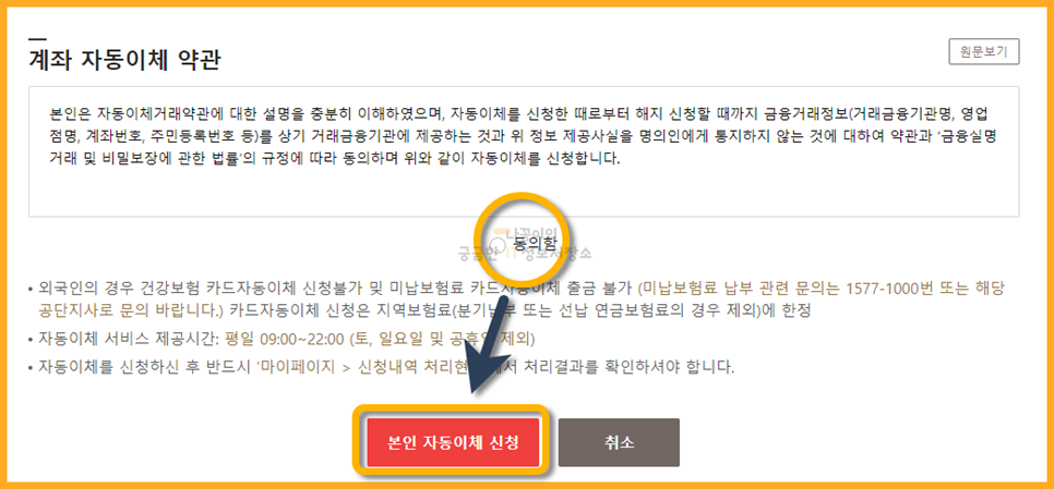 계좌등록을 마쳤다면 아래쪽에 동의함에 체크 후 본인 자동이체 신청 버튼을 클릭해줍니다.