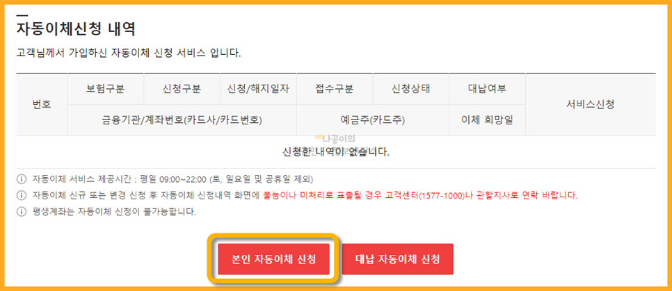 그 후 아래쪽에 보시면 자동이체 신청한 내역들이 나타나고 신청이 이미 완료된 내역이 있다면 여기에서 확인이 가능합니다. 신청 내역이 없다면 아래 '본인 자동이체 신청'을 클릭합니다.