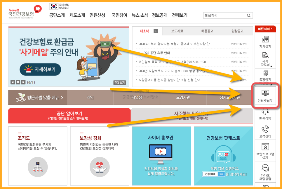 국민건강보험 홈페이지에 들어와서 자동이체 신청을 하기 위해서 아래 표시된 인터넷 납부 부분을 클릭해줍니다.