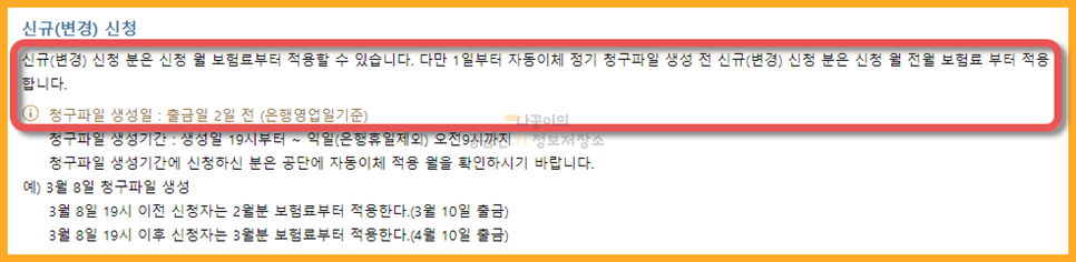 아래에 나와있듯이 신청한 달의 보험료부터 적용할 수 있다고 하며, 청구파일 생성일인 출금일 2일 전에 신청한 것은 전월 보험료부터 적용된다고 합니다.