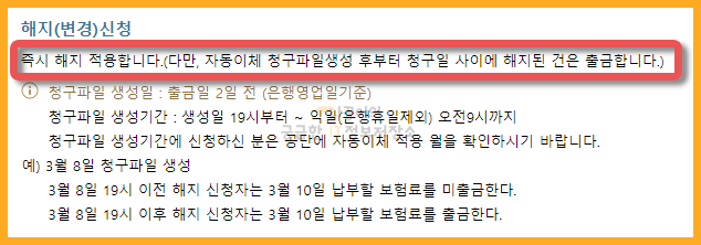 해지의 경우에는 신청하자마자 바로 해지가 됩니다. 하지만 청구파일 생성 후, 그러니까 출금일 2일 안에 해지한 것은 그대로 자동출금되니 주의하시기 바랍니다.