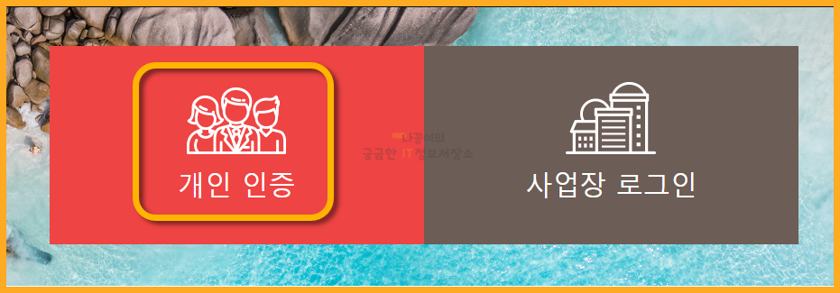 그럼 아래와 같은 화면을 보실 수 있는데요. 여기에서 사업자는 오른쪽, 개인은 왼쪽 부분을 클릭해줍니다. 이 글을 보는 대부분의 분들이 개인이실거라 생각되고 저도 사업자 폐업을 했기 때문에 개인 인증으로 진행하도록 하겠습니다.