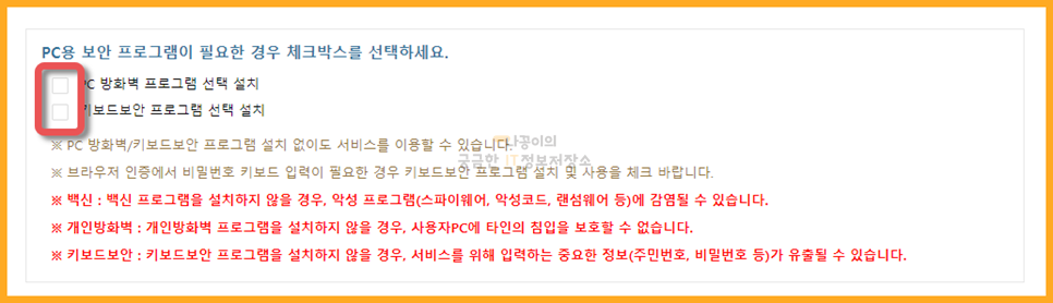 아래에 나와있는 방화벽 프로그램과 키보드보안 프로그램은 선택 설치이기 때문에 설치하지 않으셔도 자동이체 신청에는 상관이 없습니다. 개인정보가 불안하신 분들은 체크 후 설치해주시기 바랍니다.