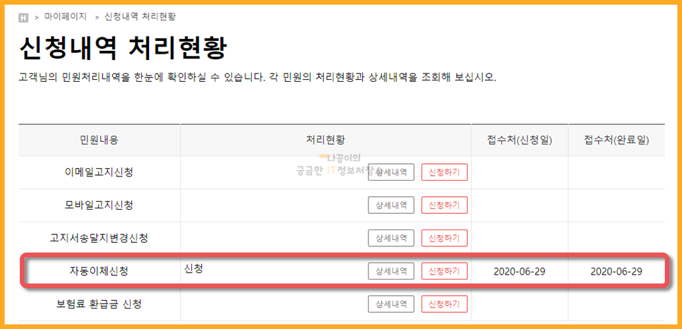 마이페이지에서는 지금까지 신청하신 내역을 확인하실 수 있습니다. 제가 아까 등록한 자동이체도 잘 되어 있는 것을 확인할 수 있습니다.
