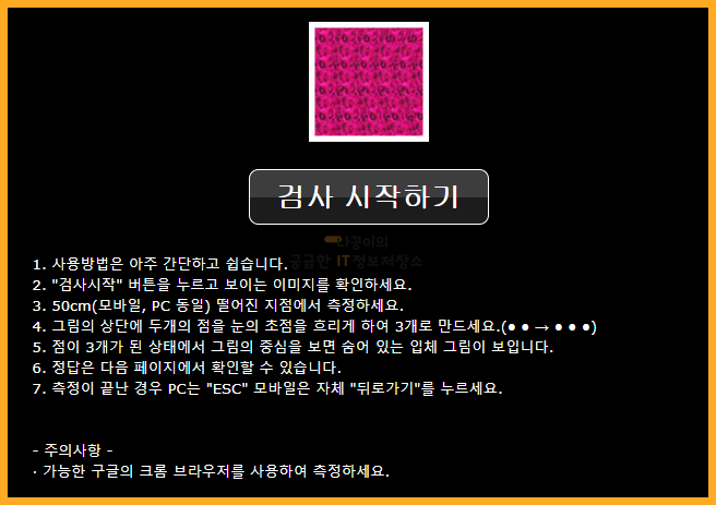 인터넷 시력검사 사이트는 생각보다 여러 군데가 있습니다. 그 중에서 제가 추천드리는 곳은 시력검사 뿐만 아니라 색맹이나 망막, 난시 등 다른 종류의 시력검사도 할 수 있는 사이트입니다. 바로가기는 아래 링크를 활용해주세요.