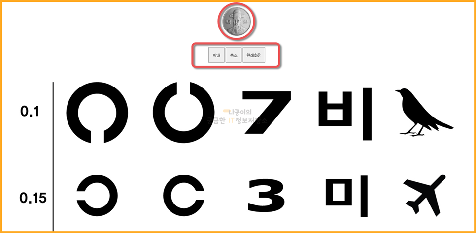 시력검사 하는 방법은 '검사 시작하기' 버튼을 누르고 100원 짜리 동전을 모니터에 대고 크기를 맞춰준 다음에 3M 거리에서 한 쪽 눈을 가리고 테스트를 하시면 됩니다.