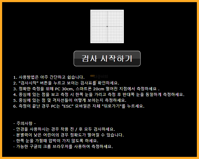 안과에 가기 귀찮으시거나 테스트로 한 번 해보고 싶으신 분들은 간편하게 인터넷 시력검사를 이용해보시는 것도 좋을 것 같습니다.