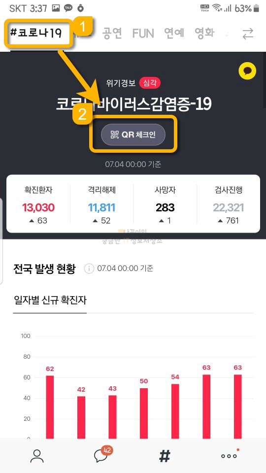 코로나19라는 곳으로 들어가서 QR 체크인을 클릭합니다.