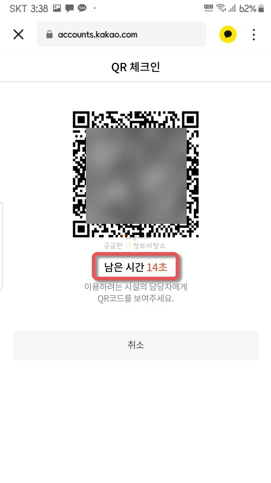 QR 출입증은 위에 나와있듯이 제한시간이 15초로 정해져 있습니다. 생각보다 짧은 시간이며 시간이 지난 경우에는 아래와 같이 인증없이 동의만 하면 새로운 코드가 다시 15초간 나타납니다.