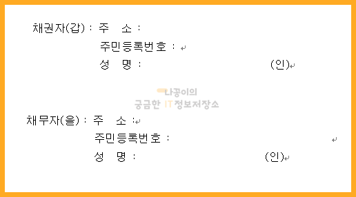 서류를 작성하시고 아래에 사인을 하시면 차용증 작성이 완료됩니다. 서류는 2부를 준비하셔서 1부씩 나눠서 보관하시기 바랍니다.