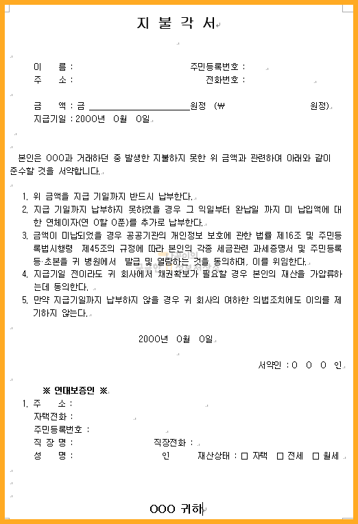 아래 지불각서 양식은 이름과 날짜 등이 000으로 되어 있으므로 각서를 작성하시기 전에 미리 한글이나 워드로 수정을 거쳐 프린트를 하시거나 다른 양식을 다운로드 받으셔야 할 것 같습니다.
