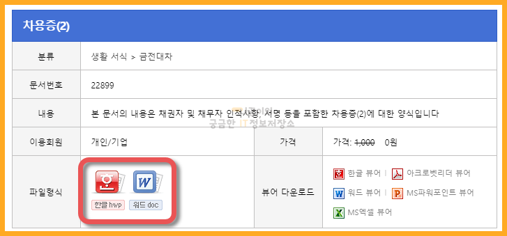 차용증을 클릭하면 다음과 같은 화면이 나오고 여기에서 빨간색으로 표시된 부분에서 설치되어 있는 프로그램 형식을 선택하시면 차용증 양식이 다운로드 됩니다.