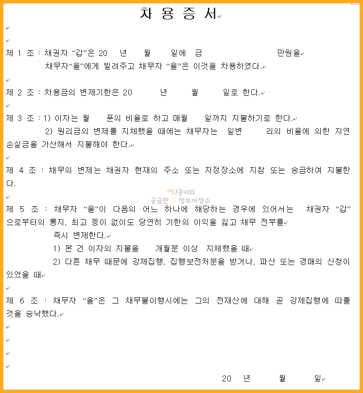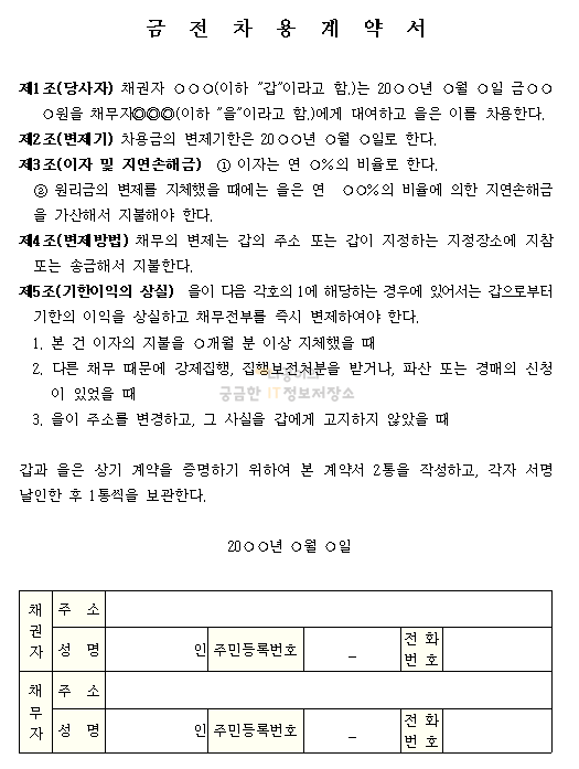 오른쪽에 있는 사진은 금전차용계약서 양식의 예시입니다. 참고하시라고 올려드려봅니다.