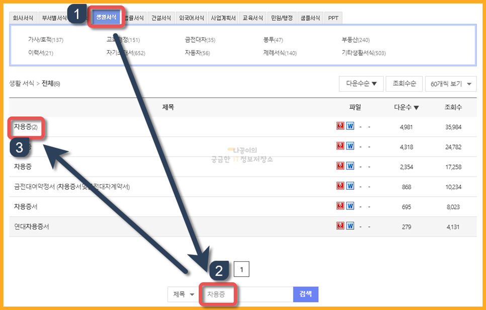 그럼 다음과 같이 무료 서식을 다운받을 수 있는 화면이 나오며, 아래의 순서대로 생활서식에서 차용증을 검색하여 클릭해주시기 바랍니다.