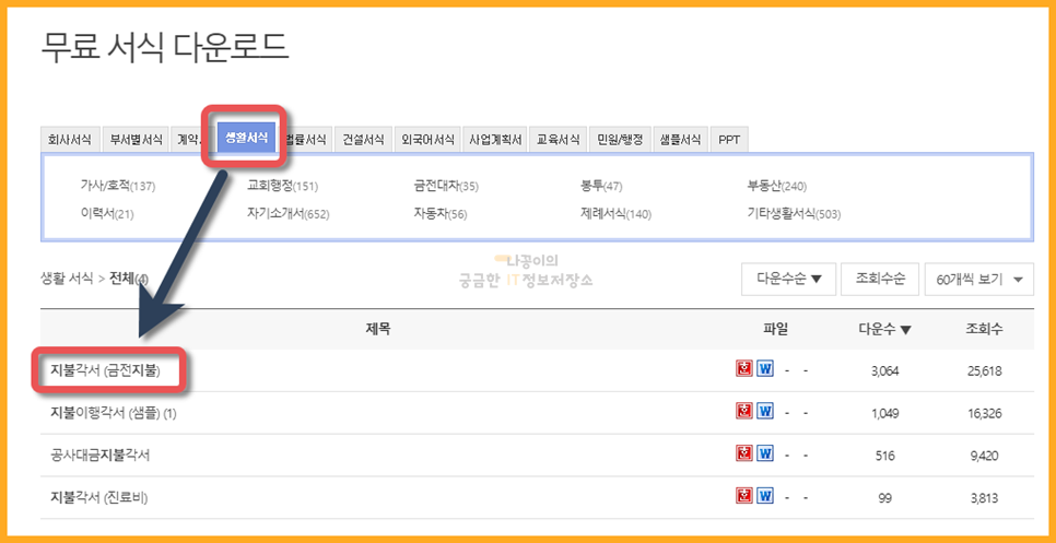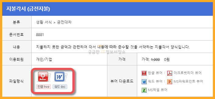 마찬가지로 생활서식으로 들어가셔서 지불각서라고 검색해주시면 아래와 같은 파일을 볼 수 있습니다.