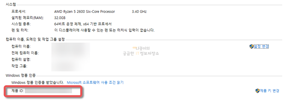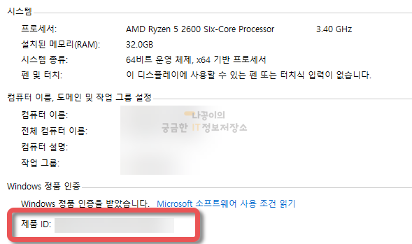 스스템을 클릭하면 1번과 마찬가지로 제품 ID를 확인해서 윈도우10의 제품키를 확인할 수 있습니다.