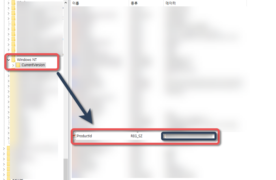 그럼 아래 사진과 같이 CurrentVersion 이라는 하위목록 하나가 나오고 그것을 클릭하면 오른쪽에 ProductId 라는 항목이 있으며 그 항목이 바로 윈도우10 제품키입니다.
