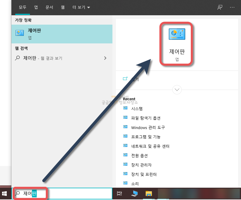타이핑을 완료하면 다음과 같이 제어판을 클릭해서 들어갑니다.