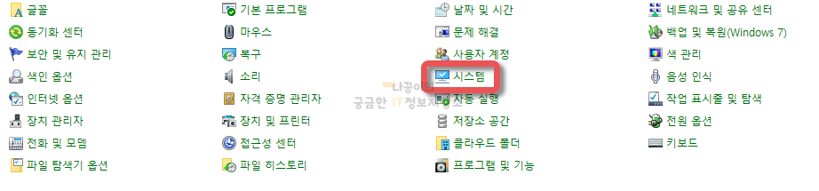 제어판의 목록에서 시스템으로 들어가주시기 바랍니다. 혹시라도 아래와 같이 보이지 않는 경우에는 상단 우측에 있는 범주를 변경해보시기 바랍니다.