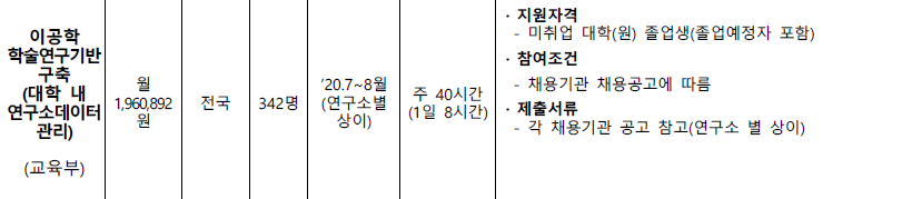 -사업내용 : 이공 학술연구기반구축사업 지원을 받는 대학중점연구소에서 취업이 곤란한 졸업생을 채용하여 실무 역량 제고 및 고용 안전망 제공